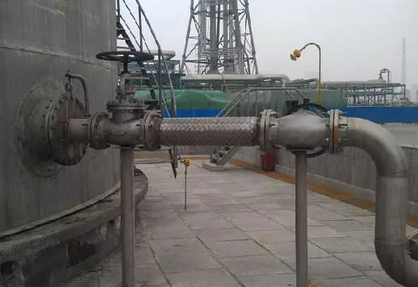 不銹鋼金屬軟管口徑較大時,作用在儲罐管口的盲板力較大,容易對儲罐管口造成損害。再加上其結(jié)構(gòu)穩(wěn)定性差,用在有毒可燃危險介質(zhì)時,較大口徑的不銹鋼金屬軟管泄露帶來的風(fēng)險增加,故國外某些工程公司以DN350分界,用于危險介質(zhì)時,DN350以下采用不銹鋼金屬軟管,以上采用不銹鋼波紋管膨脹節(jié)。