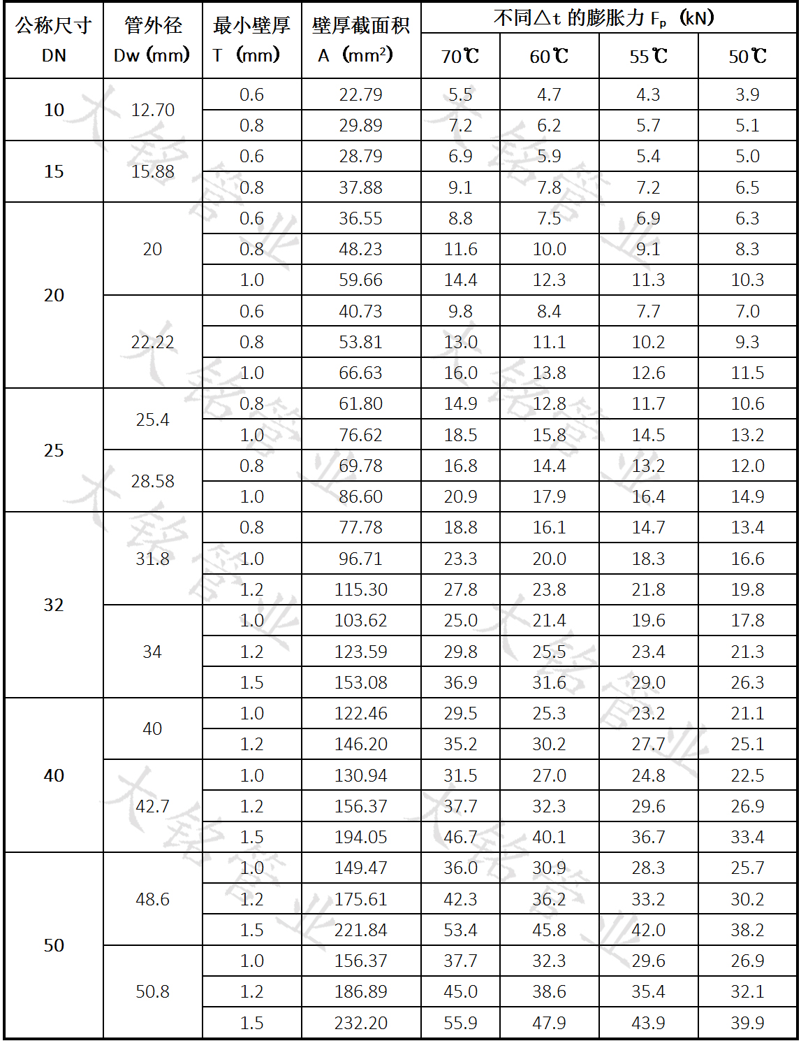當(dāng)采用固定支架限制管道變形時(shí),江蘇衛(wèi)生級(jí)不銹鋼熱水管道的固定支架應(yīng)按其支撐力大于因溫度變化引起的膨脹力設(shè)置。管道膨脹力按下式計(jì)算,具體見(jiàn)表:
